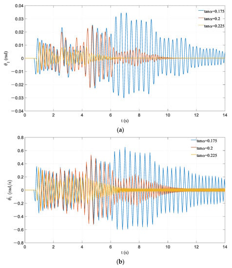 Effect of variation in tanα: (a) time history of rocking rotation; (b) time history of angular velocity.