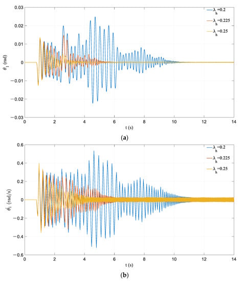 Effect of variation in λh: (a) time history of rocking rotation; (b) time history of angular velocity.