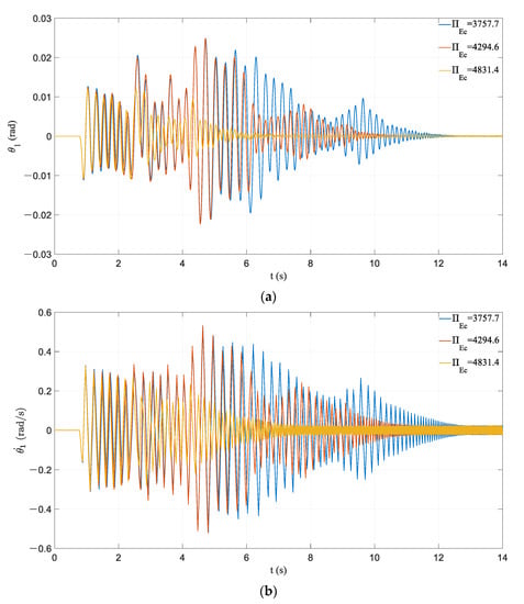 Figure 16 illustrates that the frame with a larger tends to become motionless faster than the smaller ones. When the first acceleration pulse is imported, it can be clearly seen that the response amplification of the frame with small amplitude is apparently weaker than that of the other frames. The acceleration pulse basically has no response amplification effect on the frame which is in the state of pseudo-steady-state vibration before the appearance of the acceleration pulse. The response of the frame with has a very obvious amplification phenomenon.