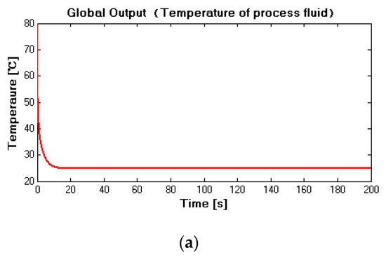 Figure 10 and Figure 11 represent the measured temperature of both fluids, Figure 10a describes the noise-free situation, and Figure 10a,b means that measurement of process temperature is corrupted by the colored noise. It can be seen from Figure 10 and Figure 11 that the temperature of both fluids at the global level varies at 120 s due to variation of pneumatic pressure at the local level. The temperature of the utility fluid in Figure 10b is not influenced by noise since measured noise was supposed on the process fluid. Thus, from Figure 11b, it is clear that the measured process fluid temperature is fluctuant with a small amplitude due to noise. These measured fluid temperatures were fed to the high-level inverse subsystem to reconstruct inputs of the high-level subsystem.