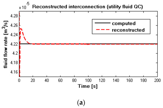 For the utility fluid flow rate in Figure 13a,b, it can be seen that the reconstructed values in red dash lines converge to the computed values in the black solid line after transient time. Because of changes at 120 s, reconstructed fluid flow rates vary accordingly and reach a new stable level. Similar to the process fluid, the reconstructed utility fluid flunctuates significantly in the noise-corrupted situation in Figure 13b. Since the reconstructed values were retrieved from the global measured temperatures by higher-level subsystems, it can be seen that the variation of variables of the local subsystem has a significant impact on the global measurements, which is consistent with the hypothesis. Moreover, the simulation results show that the influence of noise on the reconstructed value is obviously stronger than the measured value.
