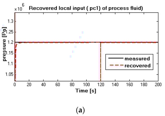 It can be seen from Figure 8a,b that the input reconfiguration capability of the low-level subsystem is confirmed. It is obvious in Figure 8a,b that the recovered pneumatic pressure of the process fluid in red dash lines converge to the measurement value in black solid lines correctly, and the short transient time is less than 2 s. From Figure 8a, during the first two seconds, oscillation is observed. It can be seen from Figure 8b that the reconstructed value is influenced clearly by measurement noise. Since recovered pneumatic pressure is also the original input of the interconnected system, thus reconfiguration capability of the global interconnected system is also confirmed.