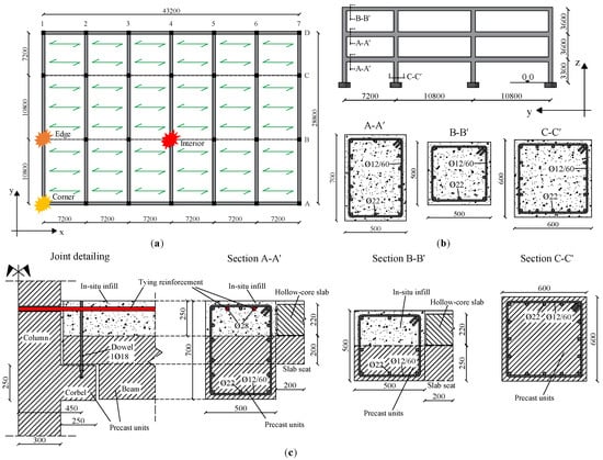 Building layout: (a) Plan view of the case-study building with column removal locations; (b) Elevation view and MRF detailing; (c) PCF detailing and beam-to-column joint. (Dimensions in mm).