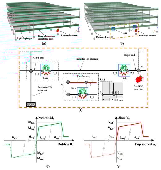 It is noted that link deformations are related to relative displacement and rotation between nodes 1_1 and 1_2 (see Figure 2c). Link degrees of freedom (DOFs) are uncoupled, so it is not possible to account for the interaction between shear and moment. The remaining DOFs were considered fixed. For the sake of simplicity, links were inserted in the only bays directly affected by column removal. The beam-to-column eccentricity was modelled by adding a rigid element between the precast column and beam nodes, see Figure 2c, which corresponds to 450 mm (refer also to Figure 1c).