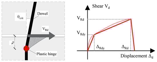 where α is set equal to 1, Ød is the diameter of the dowel, fc is the concrete compression strength, and fyd is the steel yield strength of the dowel. Referring to Figure 3, VRdy is assumed to be 0.5VRd, whereas the displacements ΔRdy and ΔRd are calculated using: