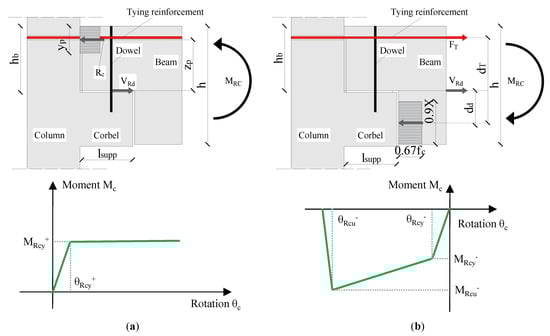 To consider the rotational behavior of structural connections between beam and adjacent column members, the moment–rotation relationships for both negative and positive branches are required. The positive branch was calculated through the formulation by El Debs et al. [50], see Figure 4a. The rotational equilibrium of the connection relies on the stress block of concrete in compression and on dowel strength. The connection skeleton curve is represented by the yield moments and rotations, and no ultimate resistance calculation is provided. For this reason, the residual strength of the connection was kept constant and equal to the yield value until large connection rotations were achieved. The negative moment branch was calculated according to Elliott et al. [51,52], see Figure 4b, which is able to consider the contributions of dowel and/or continuous reinforcement. As reported in Figure 4b, the rotational equilibrium of the connection relies on the stress block of concrete in compression and on dowel and/or continuous reinforcement forces. The connection skeleton curve is represented by the yield and ultimate moments and rotations. The residual strength of the connection is assumed to be negligible after the achievement of the ultimate rotation.
