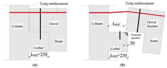 - The beam end rotation related to its curvature in the vicinity of the joint:where le is assumed equal to the column width, the length lp is equal to the sum of the corbel length lsupp and the total beam height h [52] (refer to Figure 4b) and Ibeam is the second moment of inertia of beams.