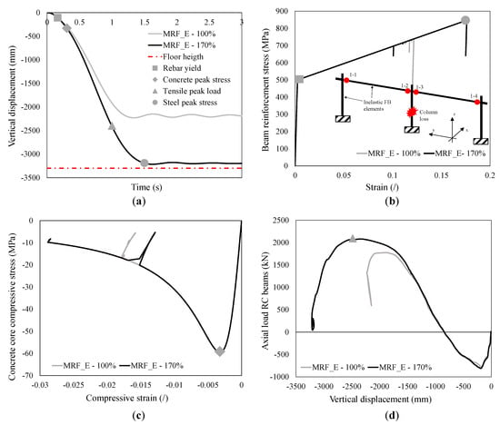 The moment resisting frame system subject to edge column removal scenario is investigated herein. Figure 6a shows the structural response results in terms of vertical displacement recorded at the location of the removed column and failure propagation occurring at the 1st floor level during progressive collapse phenomenon. Such responses are reported for the design load corresponding to accidental combination (100%·Qb,e in Table 1 for edge location) and increased load (170%·Qb,e). This procedure was adopted to establish the effective structural capacity of the selected MRF system subject to edge column loss compared to the gravity load demand. For the sake of simplicity, the sequence of failure events under increased load case is described. It is worth to note that the structure was able to sustain the increased gravity loads due to no rebar fracture occurrence and limitation of vertical displacement dictated by the 1st floor height equal to 3.3 m. Thus, the collapse load was not reached. At early stage, the first failure event was associated with the almost contemporary yield of tensile longitudinal rebars in correspondence of removed column (1-2 and 1-3 locations) and adjacent columns (1-1 and 1-4 locations) at 0.16 s (Figure 6b). This event was followed by the achievement of the concrete core peak compressive stress at adjacent columns (1-1 and 1-4 locations) at 0.30 s (Figure 6c).
