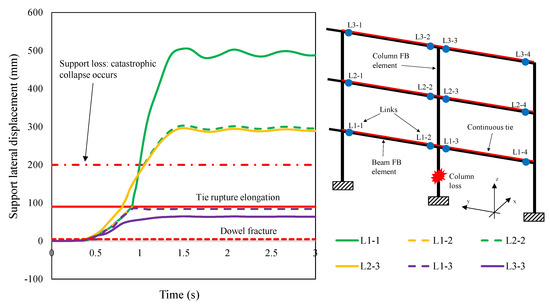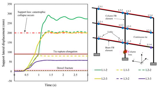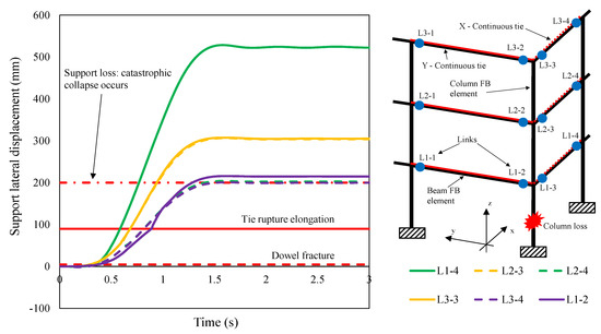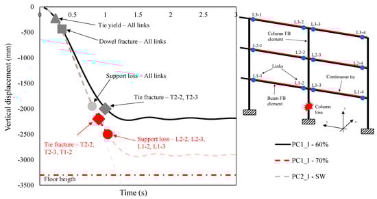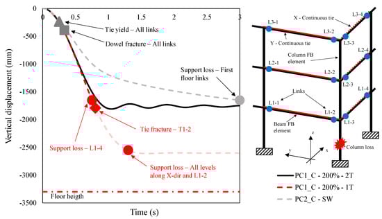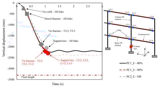 The precast frame system subject to edge column removal scenario is investigated herein. Figure 7 shows the structural response results in terms of vertical displacement recorded at the location of the removed column and main failure events occurring at the 1st ground level during progressive collapse phenomenon. As mentioned before, in addition to springs to simulate connection behavior, the PC1 model considers the presence of a tying system consisting of two 28-mm diameter rebars (indicated with red lines in the schematic view shown in Figure 7). This assumption meets the fib Bulletin 63 requirements [34]. Conversely, the PC2 model considers only springs to simulate connection behavior with no tying system. It is noted that, in Figure 7, the link and tie locations are identified with label L.