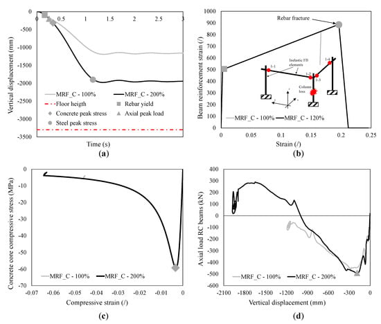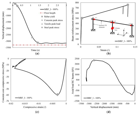 Results for MRF_C: (a) Vertical displacement; (b) Steel stress strain relation; (c) Concrete core compressive stress-strain relation; (d) Axial load of RC beams across removed column.