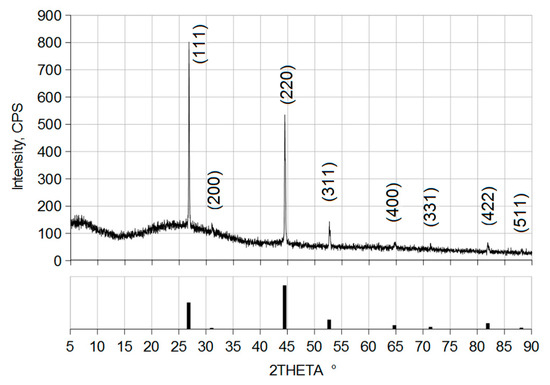 The initial state of the investigated copper selenide films has a nontrivial structure. A typical initial film surface and the cross-section of the film shown in Figure 1. The films consist of nanocrystallites with dimensions of 50–120 nm connected in large clusters. There are large sinuous pores between the clusters. This structure of the copper selenide films is common and occurs in various growth methods [17,18,19,20,21]. In the cross-sectional image (Figure 1c), two layers are clearly distinguishable by the film thicknesses. The lower layer has a thickness of approximately 630–650 nm, larger crystallites, and larger pores, while the upper layer has a thickness of approximately 220 nm, smaller crystallites, and smaller pores. The XRD patterns of the initial state within the 2θ range of 5–90° are shown in Figure 2. The characteristic peaks correspond to the (111), (200), (220), (311), (400), (331), (422), and (511) lattice planes of cubic phase (Fm-3m) Cu1.75Se to with high accuracy according to the values in ICDD card 01-075-2714. No other phases were observed in the studied layers. Notably, the highest intensity (Figure 2) is characteristic of the (111) plane, i.e., the growth of the crystallites occurs mainly in the [111] direction of the cubic structure, which is typical for Cu2-xSe films [20,21,22]. The EDX data indicate that the ratio of Cu:Se atoms in the copper selenide films after growing and annealing is 1.75:1.00; hence, the chemical composition of the films deposited by this method can be identified as Cu1.75Se. A comparison of the chemical compositions obtained by the XRD and EDX methods is in good agreement with the results. Thus, the copper selenide films in the initial state have a chemical composition of Cu1.75Se, and are characterized by a nanocrystalline structure with a complex architecture and large pore volume.