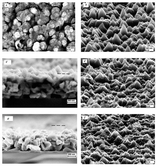 SEM images of the film surface after plasma sputtering at ion energy of 200 eV and processing times of 30 s (a,b), 60 s (c,d), and 90 s (e,f). The sample tilts during imaging were 0° (a) and 70° (b,d,f). (c,e) show cross-sections of the film. The dashed line in (c,e) shows the upper border of the lower layer in Figure 1c.