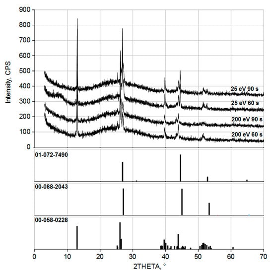 The X-ray diffractograms of the samples after plasma treatment at ion energies of 25 and 200 eV for durations of 60 and 90 s are presented in Figure 5. The results of the X-ray diffractometry indicate a change in the phase composition during ion sputtering. In the initial state, the films were single-phase cubic crystal lattice Cu1.75Se. After plasma treatment with 25 eV argon ions for 60 and 90 s, three phases appeared: cubic phase berzelianite Cu1.78Se (ICDD card 01-072-7490), monoclinic phase Cu2Se (ICDD card 00-058-0228), and cubic phase berzelianite Cu2Se (ICDD card 01-088-2043). After plasma treatment with 200 eV ions, two phases appeared in the diffractograms: monoclinic Cu2Se phase (ICDD card 00-058-0228) and cubic Cu2Se phase (ICDD card 01-088-2043). The coexistence of the cubic and monoclinic phases in Cu2-xSe is expected and has been reported previously, for example, in bulk samples synthesized via conventional solid-state sintering technology in [35]. Thus, the results of X-ray diffractometry of Cu2-xSe films, after plasma sputtering, are in good agreement with the EDX data, and confirm the transformation of Cu1.75Se to Cu2Se during the Ar plasma treatment.