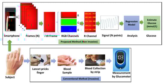 The complete experimental procedure of noninvasive sensing and a comparison with the conventional method of glucose level prediction have been depicted in Figure 1. With the proposed noninvasive technique, a commercial smartphone camera can be used for the recording of a short video (20 s–50 s) of the subject’s fingertip, which is then converted into frames containing RGB channel information of different wavelength. Red light has a longer wavelength than green or blue, which consequently allows it to penetrate deeper into tissue. Consequently, data from the red channel can be used for generating the respective PPG signal from the video frames. Regression models can then be trained with the acquired smartphone PPG signals, and corresponding glucose levels are acquired with a commercially available glucometer.