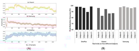 The quality of the PPG signal acquired from the same subject using three different smartphones is shown in Figure 2. In the first two signals, considerably more baseline variation can be observed in contrast with the third signal. To further evaluate the performance of the acquired signals by these phones, we attempted to extract the features from the acquired signals. For this, the signals were first preprocessed (Supplementary Material Figure S2) to remove high-frequency noise and baseline drift. Then, peak analysis was performed on the preprocessed PPG (Supplementary Material Figure S3)—the 1st derivative and 2nd derivative (Supplementary Material Figure S4) of the signals. From Supplementary Material Table S1, it can be seen the model was able to detect the 2nd derivative peak with very few misses and false positives across all the subjects. We performed peak detection and observed the results as shown in Figure 2. With 5 different subjects and multiple trials with the three candidate smartphones, we could see that the Xiaomi was outperformed by the others in terms of accuracy.