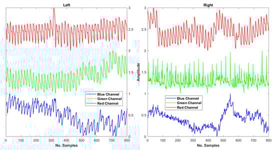In the proposed system, we initially extracted a PPG signal from all three channels. In most cases, PPG extracted from the red channel was more prominent and less noisy than that of the green and blue channels, as seen in Figure 3.