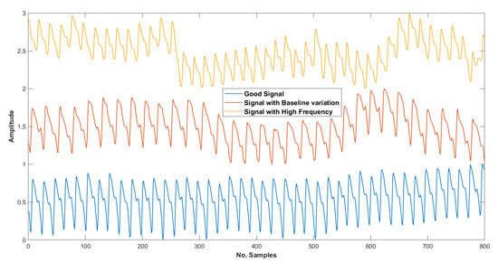 Even after careful considerations about the type of camera to be used and orientation of the placement of the fingertip, the acquired signals had certain varieties. This is evident in Figure 4, which provides three sample signals collected from different subjects. It can be seen that one of them is quite clean, another has few baseline variations, and the last one contains high-frequency noises and baseline variations. The accuracy of PPG signal is highly influenced by the motion artifacts resulting in inaccuracy in calculation of vital features. These motion artifacts, baseline wander, and high-frequency noise are due to the invariably interference of the contact between the smartphone camera and the finger, the voluntary or involuntary subject movement that includes respiration and extrusion between the finger and the smartphone camera. Therefore, it is crucial to develop a reliable series of preprocessing steps to enhance uniformity and reliability of PPG signal acquisitions.