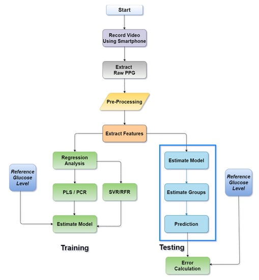 The proposed approach for the noninvasive estimation of blood glucose level using a smartphone video has been explained through a flowchart in Figure 5. Video data were first obtained from the subjects’ fingertips which were then converted into the respective PPG waveform. This signal contains noise and motion artefact, which were cleaned in the preprocessing steps. Relevant features were extracted from the preprocessed signals. These features were then fed into a regression model. The regression model was trained using extracted features and reference glucose values, collected invasively using a commercially available glucometer. Then, the trained model was used to estimate the glucose level of an unknown sample. The unknown samples used for the testing purpose followed the same preprocessing and feature extraction techniques as the training phase. The performance of the model was evaluated by calculating the Standard Error of Prediction (SEP), measured in mg/dL.