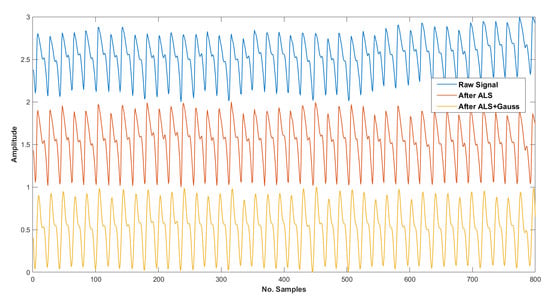 ALS is a useful baseline correction technique [42]. Motion interferences were removed by the help of ALS, which is useful in correcting data with relatively narrow peaks. ALS is useful in making the systolic and diastolic peaks more prominent, which are crucial attributes for feature extraction. The baseline correction through ALS improved the overall signal quality as the fluctuations between peaks were decreased.