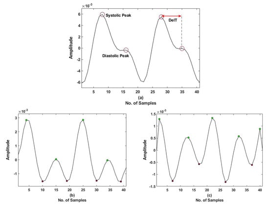 DelT refers to the time separation between systolic and diastolic peaks. It was computed from each pair of the systolic–diastolic peaks of the signal. DelT found from the time difference between the systolic and diastolic peak in each cycle of the preprocessed PPG signal were stored in an array. The systolic, diastolic and DelT features are presented in a sample PPG signal in Figure 7a.
