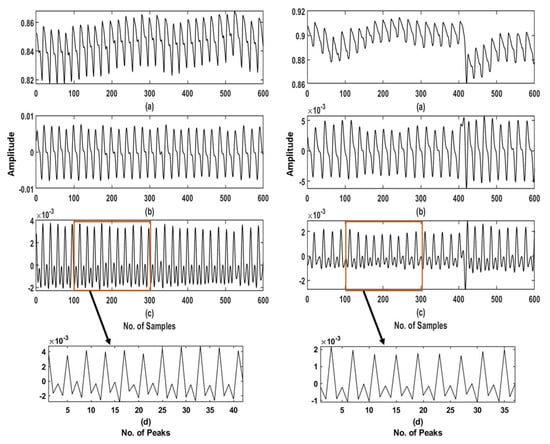 Two representative PPG signals—(left): relatively prominent PPG signal and (right): a signal with high baseline issues and noises processed through different steps. (a) Raw PPG Signal; (b) PPG signal preprocessed with ALS and Gaussian filter; (c) first derivative of preprocessed signal, and (d) extracted features of first derivative signal.