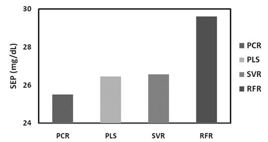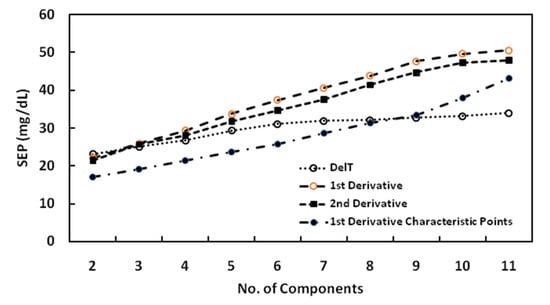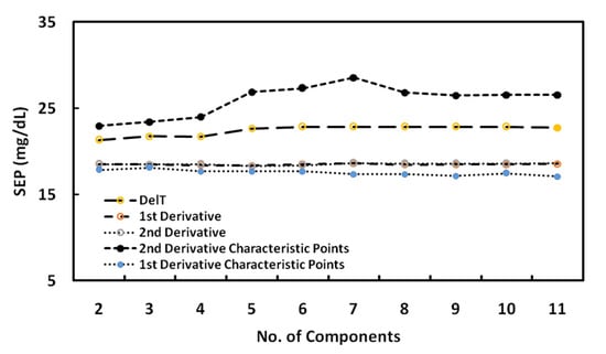 Figure 9 shows the estimated Standard Error of Prediction (SEP) against the different number of principal components (PCs) achieved for PCR model built with different approaches. For the PCR model built using second derivative characteristic features, the SEP was markedly greater than other approaches. In addition, when the numbers of principal components were incremented, the SEP increased as well, increasing from 22.95 mg/dL on the second component to 26.54 mg/dL with 11 PCs.