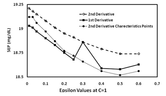 The SVR models were built with a Radial Basis Function (RBF) kernel. This kernel function was used to transform an n-dimensional input to an m-dimensional input, where m denotes much higher than n. The RBF kernel finds the dot product in higher dimensional more efficiently than any regular linear or polynomial kernels. The main idea to use kernel is to fit a linear classifier or regression curve in higher dimensions, which consequently produces a nonlinear classifier or regression curve in lower dimensions. In our study, the size of the kernel cache was set to 400 for training and the constant regularization parameter C was set to 1.0. The maximum penalty ε (epsilon) was tuned from 0 to 0.6 for each of the SVR model to reduce SEP. Figure 11 illustrates the estimated SEP of SVR models built with different features against epsilon tuned within a certain range. With the exception of the first derivative SVR model, a decreasing trend in SEP could be observed for the SVR models with an increase in epsilon from 0 to 0.5. The lowest SEP recorded for different models is shown in Table 4. The SVR model with second derivative characteristics features achieved the lowest SEP of 18.52 mg/dL even though other models also had comparable margins of error.