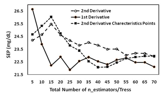 Finally, similar models were built with Random Forest Regression (RFR) for the estimation of glucose level and performances were evaluated using the same metric. RFR models are built with estimator trees/nodes and in this study, the total number of trees/nodes was increased up to 70 for all the models to identify the optimum number of trees required for the prediction with the lowest error. Some sample leaves were also added for the improvements and the total number was set to six. The SEP of RFR models built with different features against the number of estimator tress/nodes can be found in Figure 12. The prediction error for all the RFR models decreased with the increase in the number of trees/nodes. This reduction in SEP was comparatively sharp for the model built with first derivative features particularly for the first 15 trees. The lowest SEP recorded for different models along with the number of trees required is provided in Table 5. Notable in the table is that RFR model built with first derivative features had the lowest SEP of 21.88 mg/dL with requiring 25 trees to estimate. The model built with second derivative characteristic features had a similar prediction error of 22.11 mg/dL, though it required nearly double the number of estimators.