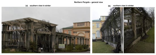 General view of the Northern Pergola in winter from the southern (a) and the north-facing side (b).