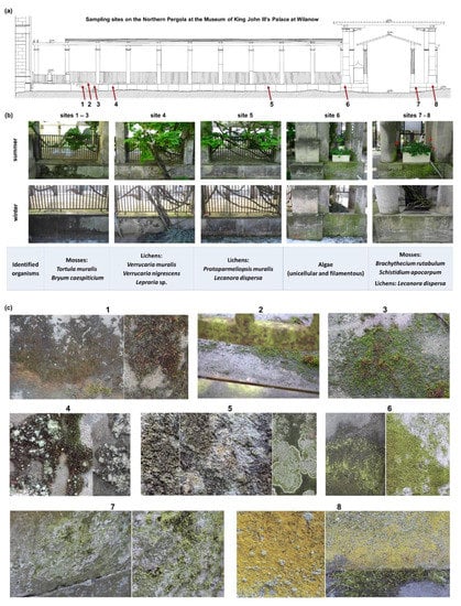 Architectural chart of the Northern Pergola at the Museum of King John III’s Palace at Wilanow with sampling locations (a), most important identified characteristic species of organisms inhabiting sandstone surfaces (b) and biodeterioration patterns of the sandstone surfaces (c).