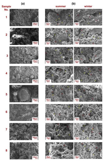 Nevertheless, microscopic observations (SEM images) of samples taken in winter as compared to summer samples allowed to visualize finer sediment structures in the analyzed material in samples 4–8. These differences can result from night frosts, which can affect both the weathering processes and the biodeteriogen consortia themselves, such as cell shrinkage.