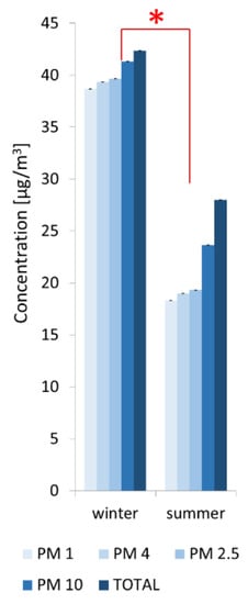 Particulate matter (PM) concentrations in the air in summer and winter in the gardens surrounding the Northern Pergola at the Museum of King John III’s Palace at Wilanow. The PM abbreviation means particulate matter with an aerodynamic diameter grain size expressed in µm. The data represent averages with standard deviation. * -Indicates significant differences according to the Student’s t-test (p ≤ 0.05) when comparing PM concentrations between winter and summer.