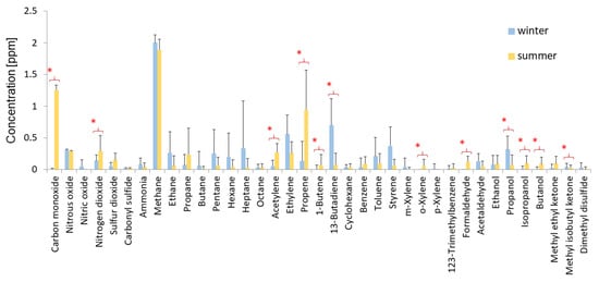 Concentrations in ppm of selected chemical compounds in the air in the Northern Pergola at the Museum of King John III’s Palace at Wilanow. The data represent averages with standard deviation. * -Indicates significant differences according to the Student’s t-test (p ≤ 0.05) when comparing the concentration of selected chemical compounds between winter (blue bars) and summer (yellow bars).