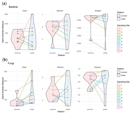 Alpha diversity of bacterial (a) and fungal (b) communities. For all analyzed samples, Chao1, Shannon and Simpson indices were calculated. The samples were colored and connected by sampling site, as well as grouped by season as indicated in legend.