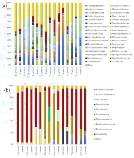Analysis of the distribution of fungal families demonstrated that their seasonal stability was associated with the dominance of (Figure 7b): Herpotrichiellaceae (sites 2, 3 and 4); Bulleribasidiaceae (site 8); Parmeliaceae (site 6); Ramalinaceae (sites 4, 5 and 8); Teratosphaeriaceae (site 5); and Trichocomaceae (site 3). There were also fungal families which dominated in the summer season, i.e., Herpotrichiellaceae (site 1); Physciaceae (site 5); and Ramalinaceae and Nectriaceae (site 7); or in the winter season: Teratosphaeriaceae (sites 1 and 6); and Stereocaulaceae (site 4).