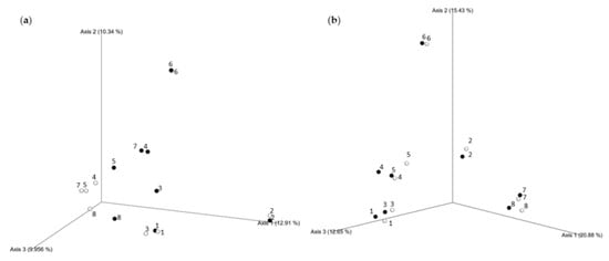 The composition of the bacterial and fungal communities in samples from subsequent winter and summer seasons was also visualized using Principal Coordinates Analysis (PCoA). Our data indicate that the highest differences between seasons were documented in samples from sites 3, 4, 5, 7, and 8 for bacterial diversity, and from sites 4 and 5 for fungal diversity (Figure 8).