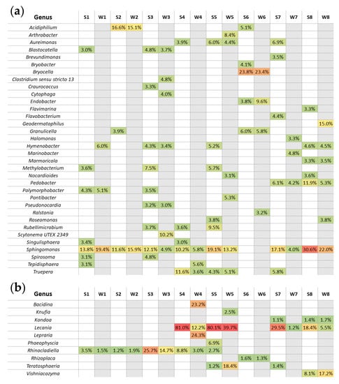 Bacterial (a) and fungal (b) genera dominating across samples. On two heat map-like figures, genera that represent at least 3% (in case of bacteria) or 1% (in case of fungi) relative abundance in each sample are shown. Overall, there are 34 bacterial genera (a) that seem to be the most represented. In case of fungal analysis (b), 10 different genera are shown. The abundance of each genus above the threshold was colored from green (the smallest percentage) to red (the highest percentage) while the empty cells were colored according to the season, i.e., white–summer (S prefix), grey–winter (W prefix).
