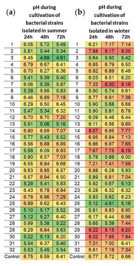 Acidifying activity of the selected bacteria strains (1–32) isolated in summer (a) and winter (b) seasons from biofilm surfaces located on the Northern Pergola. Heat maps present the pH after 24, 48 and 72 h of different bacterial isolates incubation in Blickfeldt liquid medium. The data represent averages of three independent experiments.