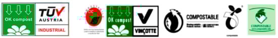- TÜV Rheinland® DIN CERTCO. Available online: https://www.dincertco.de/din-certco/en/main-navigation/products-and-services/certification-of-products/environmental-field/products-made-of-compostable-materials-for-home-and-garden-composting/ (accessed on 22 October 2020).