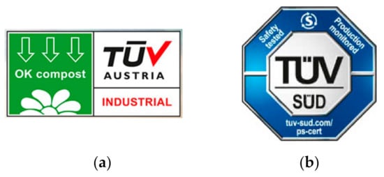 It is no longer possible to use the old plastic bags marked with the words “for internal use” or “not for goods removal”. With this law, Italy appeared as the first European country that has begun working actively for an innovative path of bio-economy and circular economy. The biodegradability, compostability, and renewable row material content of the different bags must be certified by the accredited bodies previously reported (Section 1, Figure 1). As an example, among those available in Europe, TÜV AUSTRIA (formerly Vinçotte) is the certification body that currently issues the “OK compost” conformity label, similar to the one shown in Figure 2a.