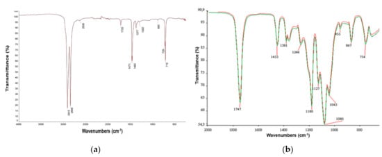 FTIR analysis is a spectroscopic technique exploiting electromagnetic radiations ranging from 2500 nm to 25,000 nm of wavelength. FTIR spectroscopic technique provides rapid analytic data which, if properly processed, could provide chemical information concerning samples, therefore reflecting manufacturing processes, samples quality, differences or similarities in chemical composition, appearance, physical characteristics of the samples, etc. []. FTIR spectroscopy, together with other chemical characterizations, is the analytic technique adopted by TÜV Italy and DIN CERTCO to carry out periodic checks of all registered or certified products, and to confirm their certification during the period of validity of the mark []. FTIR technique has the advantages of being usable for both liquid and solid samples, requiring little or no sample preparation and no additional chemicals or consumables [,]. It is non-destructive, easy to use, fast, reliable, precise, and low cost [,]. By acquiring the FTIR spectrum on a sample, the instrument provides a graph composed of peaks characterized by an intensity, expressed as a percentage of absorbance or transmittance (A% or T%), as a function of wavenumbers (cm−1), usually in the range 4000–400 cm−1. When the spectral data of n samples are put together in the same matrix, a matrix is achieved whose dimensions depend on the n value. Sometimes, it is possible to compare the spectral data and detect the physicochemical differences between the samples under study simply by observing the spectra obtained. Otherwise, in most cases, this is not possible, both because the differences are minimal and because the very large number of samples makes the work not feasible. Figure 3a,b report the FTIR spectra of polyethylene (PE) and PLA, respectively, acquired in transmission mode and showed in transmittance scale (T%). They were included to show the substantial differences existing in the spectra of PE and PLA, which are the two polymers typically contained in shopping bags made with old plastics and compostable ones, respectively.