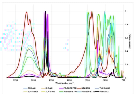 Figure 4 shows the FTIR spectra acquired in transmission mode and reported in absorbance scale of 10 significant samples out of the 22 analyzed in this study and reported in Section 2.2 (Table 2).