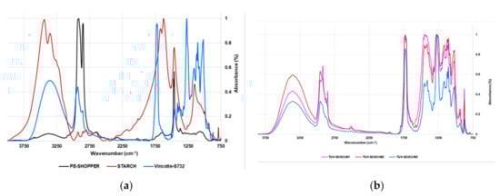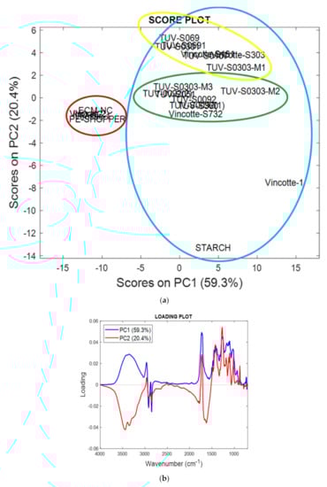 Figure 6 showed the PCA results obtained processing the matrix containing the spectral data of all 22 samples, using R software, represented both as a score plot (Figure 6a) and a loading plot (Figure 6b). Accordingly, all three new MecPlast films were found to be part of the population of films clustered in the right side of the score plot, considered compostable and biodegradable, due to the presence of starch (Figure 6a). This population, circled in light blue, was well separated from the population of films considered to be of irregular plastic, due to the presence of PE-based shopping bag (circled in red) on the principal component 1 (PC1), explaining the 59.3% of variance.