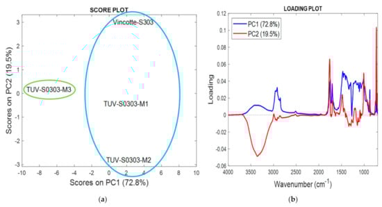 Unfortunately, the PCA results highlighted that only in the delimited area of Genoa, up to 4 films out of a population of 20 (20%), despite being marked for compliance, were found not included in the cluster of the compostable population. Surprisingly they were found very distant from starch, and in the cluster where the entirely non-degradable plastic-based film (PE-shopper) was included (Figure 6a, circled in red). With insights on the three MecPlast samples (M1, M2, and M3) using selected compostable samples as references, Figure 7 shows the PCA results obtained processing the small matrix collecting spectral data of M1, M2, M3, and of the MecPlast films, which received the TÜV Italy mark in 2017 (Vinçotte-303), and that was inserted as a reference for films approved by TÜV Italy. Figure 8 shows PCA results obtained handling the matrix gathering the FTIR data of M1, M2, M3, Vinçotte-303, and Vinçotte-S732, i.e., the film with PLA content ≥ 40% and thickness < 15 µm. It was included as a reference for films with the requirements to be classified as suitable for contact with bulk foods. The PCA were performed using R software, and the results were represented both as score plots (Figure 7a and Figure 8a) and loading plots (Figure 7b and Figure 8b). In both cases, all samples were well separated on PC1 in two clusters (Figure 7a and Figure 8a), thus highlighting a substantial difference between samples S303, M1, and M2, located in the right side of the score plot (circled in light blue), and M3, located in the left side of the score plot (circled in green). These results confirmed what was already visible in the PCA reported in Figure 6a, where M1 and M3, although belonging to the compostable population separated on PC1, belonged to different populations separated on PC2. It is interesting to note that, concerning separation on PC2 in Figure 6a, M2 was included in the same population of M3, but observing this group, a further separation of M2 from such group (on PC1) is observable, announcing some significant difference between M3 and M2, as confirmed by PCAs in Figure 7a and Figure 8a.