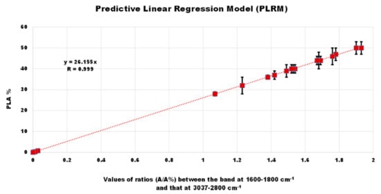 The scope of this part of our study was to build a linear regression model by least squares approach, using selected spectral data and the relative PLA concentrations computable as explained later, to predict information on PLA content of a sample. The model was built to provide MecPlast with a tool for estimating the minimum PLA content in a newly extruded film, prepared with the correct content of PLA, but that for any unforeseen events occurred during the production process, could not respect the expectation. The model was not created to highlight any fraud and identify non-compliant bags, which is the task of the bodies which grant the conformity mark. According to the FTIR spectrum of PLA (Figure 3b), we decided to calculate the ratio between the areas of bands (A/A%) in the range 1800–1600 cm−1 and 3037–2800 cm−1. The measurements were made using FTIR spectra in the absorbance scale automatically, by using the Turbo chrome workstation (version 6.1.1.) equipment software. The band at 1800–1600 cm−1 (C=O group of PLA) was considered indicative of PLA% content on the basis of the loading plots obtained by the PCAs, and therefore it was selected as significant spectral data, to construct the model. Moreover, in order to minimize the error related to the difference in the optical path of the sample pieces deposited between the KBr dishes, the values of the area ratios (A/A%) between the A% of the band in the range 1800–1600 cm−1 and that of the bands in the range 3037–2800 cm−1, also evidenced as significant bands by loading plots, were considered as more reliable spectral data. The relevance of these bands was confirmed by the loadings profiles obtained by the PCAs (Figure 6b, Figure 7b, and Figure 8b). Taking as reference the Vinçotte-S732 sample, having a minimum declared content of PLA of 40% and an A/A% value of 1.52, the minimum PLA percentage content of all the film samples was calculated through the use of mathematic proportions. The data obtained were reported in Table 5.