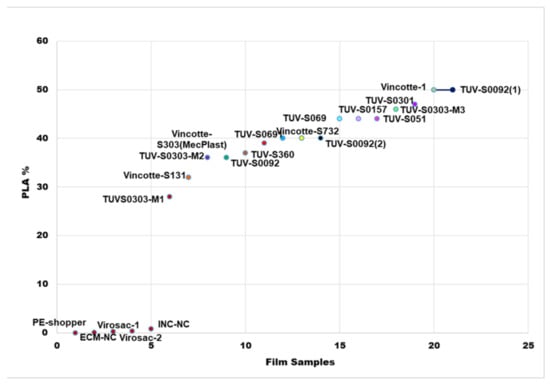 The model in Figure 9 confirmed that, in addition to the irregular PE-based sample, four other samples also have an insignificant PLA content, even if they are present on the market as regular bags. Furthermore, it was found that in the population of films deemed compliant with the regulations on biodegradable and compostable films [], only some samples had the requirements to be used as primary packaging for bulk foods or to be supplied for hygienic purposes, while the others were eligible to be used as carrying bags, only.
