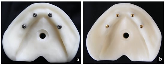 Two reference models, representing the patients, were obtained from a single silicon oral impression of an edentulous mandible model rehabilitated with four implants in the position of canines and second premolars, following the ideal “all-on-four” concept [8]. Each implant was placed according to a predetermined angulation: the axes of implants in canine position were orthogonal to the occlusal plan, and the axes of implants in second premolar were angulated distally for 30 degrees. The models were made using epoxide resin (Trias Chem Srl, Parma, Italy,) loaded at 300% in order to enhance the mechanical properties and to withstand to the chewing loading without modification, mimicking the mandibular bone. Four implant analogues (3.5 × 10 mm; NobelBiocare, Kloten, Switzerland) with internal hexagonal connection were used. A calibrated hole was performed at the center of the model to fix it to the machine for the dynamometric control of the loads (Figure 1a,b).