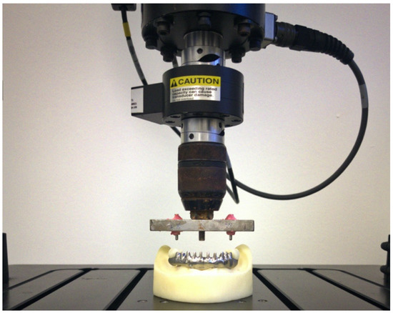 Connecting screws were tightened on implant analogues according to manufacturer’s indications with a torque-controlled dynamometric micromotor, Implantmed Plus (W&H, Brusaporto—BG, Italy). Torque values were the following: 15 N/cm for angulated posterior implants and 35 N/cm for straight anterior implants on Model A, 25 N/cm for Model B. Implant screws were then retightened 10 min after the initial torque application in order to compensate the settling effect, described by Winkler et al. [18]. After 10 min, screw insertion torque was measured with the same machine. Loading cycles on 7-mm distal cantilever were simulated using MTS-Acumen 1 (MTS Systems S.R.L, Turin, Italy), an electrodynamic testing machine which acted as a presser dynamometer on which was mounted a metal bracket ending with two spherical geometrical tips that were positioned on the central fossa of the first molars of the model (Figure 3).