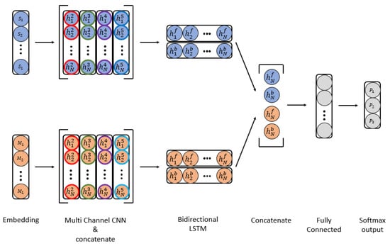 Long Short-Term Memory (LSTM) is a network that complements the gradient vanishing problem and long-term dependency problem in RNN. Figure 4 describes Bi-LSTM structure with LSTM operations forward and backward. Bi-LSTM has the advantage of being able to specify sentence information by training the forward and backward information of the sequence [25]. In the model proposed in this study, C, the output result of multiple filter 1D-CNN, was used as the input of Bi-LSTM. As the forward sequence, was used as the input of the forward LSTM, and backward, the reverse of the forward sequence, was used as the input of the backward LSTM. and represent the forward and backward output values of LSTM respectively. Final outputs of Bi-LSTMs were [, ], which concatenate and . Equations (5)–(10) are an equation that derive the output of the LSTM. , , , , , mean input, output, cell state, forget gate, input gate, and output gate, respectively. Equation (5) shows what information is to be discarded from the cell state, and the weight is determined through the sigmoid layer. Equation (6) represents obtaining new information by deriving the input gate. The hidden state is derived through Equation (7). The cell state is derived through Equation (8), and the output gate is derived through Equation (9). Finally, the output is derived from Equation (10).