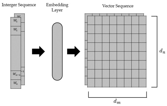 Methods of embedding elements in vector space include language model [15,16], word2vec [17,18], dependency-based context [19], global vectors of words [20], word representation through the artificial neural networks. In this study, syllables and morphemes were embedded in vector space using word representation through artificial neural networks. The embedding layer places elements in the vector space. Furthermore, as the model was trained, elements with similar roles are placed closer together in vector space. Figure 2 shows the conversion of an integer sequence to a vector sequence through an embedding layer. When the integer sequence is input to the embedding layer, the values of the sequences are converted into the -dimensional vector value, , and converted into a vector sequence. The term here means the integer value of a syllable or morpheme. After each integer value was converted to the -dimensional value, the sequence of vectors was made.
